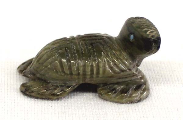 Native American Zuni Carved Serpentine Sea Turtle by Karen Zunie, measures 1'' x 5/8'' x .5''H and is signed on the bottom