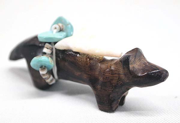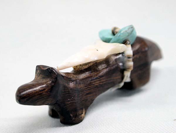 Native American Zuni Carved Wood Fox Fetish. Has white carved arrowpoint and turquoise heishi power pack. Measures 1/4''Wx3/4''Hx2.25''L. Buyers Pay Actual Shipping and Handling Charges(see terms and conditions for more information).