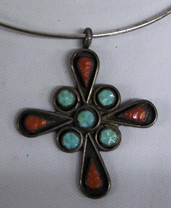 16'' Choker-style necklace with Zuni turquoise & coral stones pendant, cross shaped. Pendant length is 1.5'' Buyers Pay Actual Shipping and Handling Charges(see terms and conditions for more information).