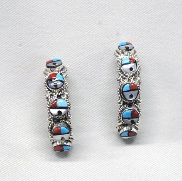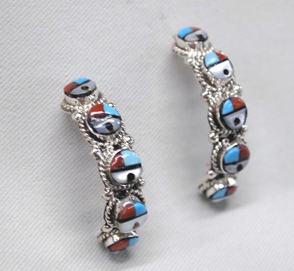 Native American Zuni Silver, Turquoise, Jet, Coral, MOP Sun Face Earrings, measure 1.5''. Buyers Pay Actual Shipping and Handling Charges(see terms and conditions for more information).