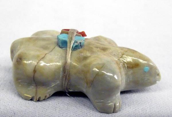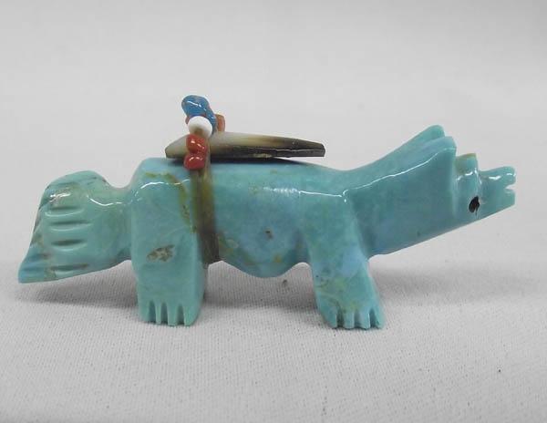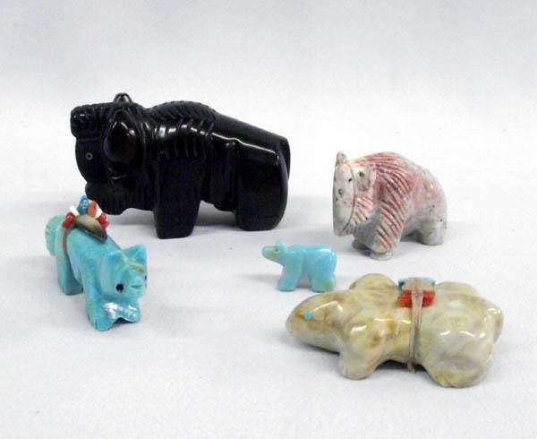 5 Native American Zuni Fetishes. 1 Jet Bison with turquoise eyes, measures approx. 1.5''H x 2.5''L. Very Small Bead Bear Fetish, Turquoise fox with an abalone on his powerpack and has a chip out of the end of his tail, stone agate badger, turquoise eyes with powerpack, rose quartz bison. Buyers Pay Actual Shipping and Handling Charges(see terms and conditions for more information).