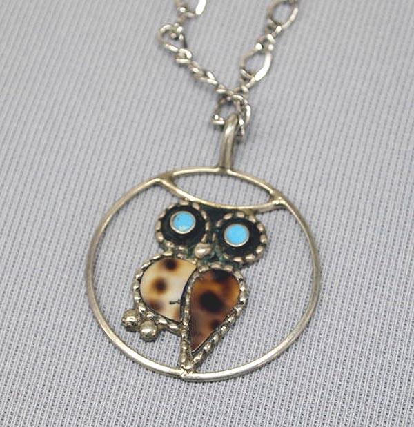 Native American Zuni Turquoise & Shell Inlay Owl Necklace, Chain measures 23'' end to end and owl pendant measures 1.25'' x 1.25''. Buyers Pay Actual Shipping and Handling Charges(see terms and conditions for more information).