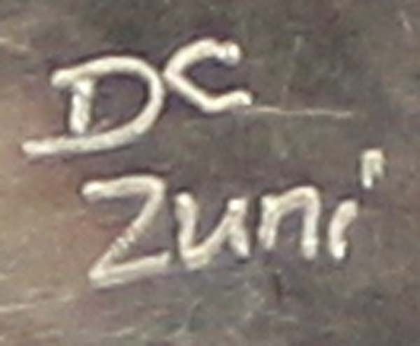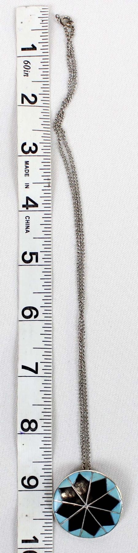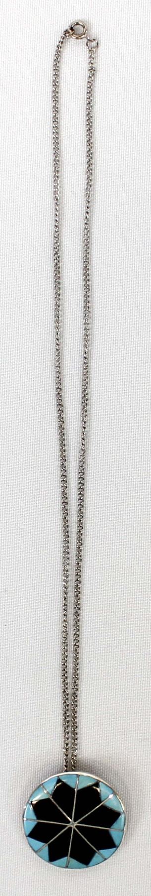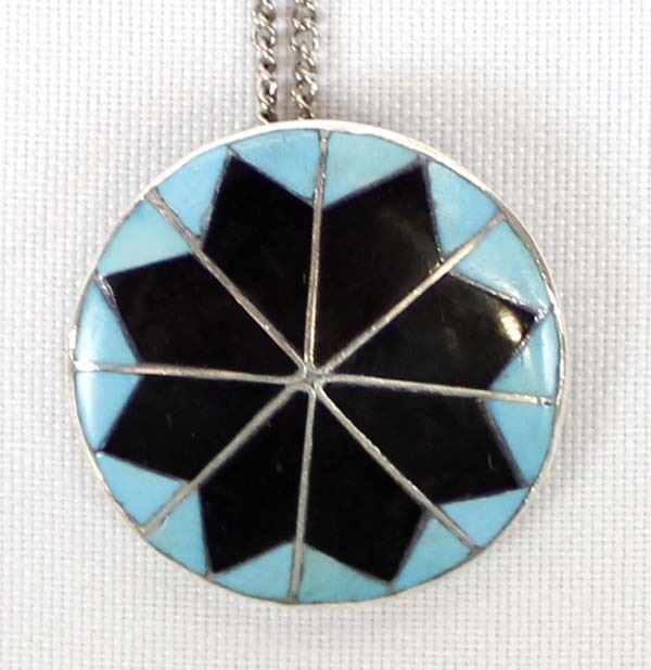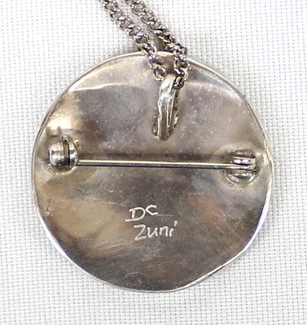 Vintage Native American Zuni Sterling Inlay Pin Pendant Necklace, pendant measures 1.25''D and is hallmarked DC, chain measures 18''L end to end