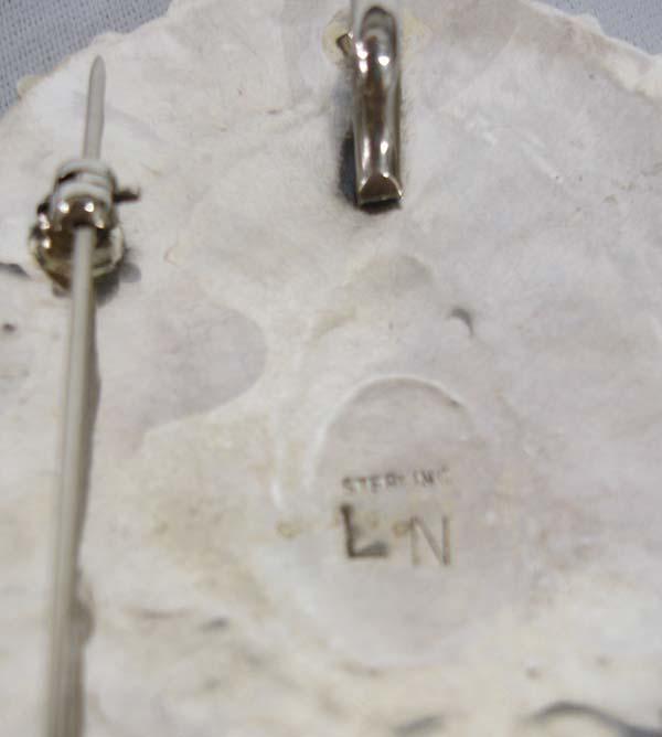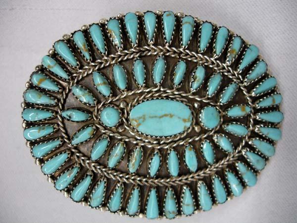 Zuni Large Silver Cluster Turquoise Pin/Pendant Hallmarked on Back, ''LN'' and ''Sterling.'' Measures 3''x2-1/8''. The center stone is 5/8''x3/8''. Buyers Pay Actual Shipping and Handling Charges(see terms and conditions for more information).