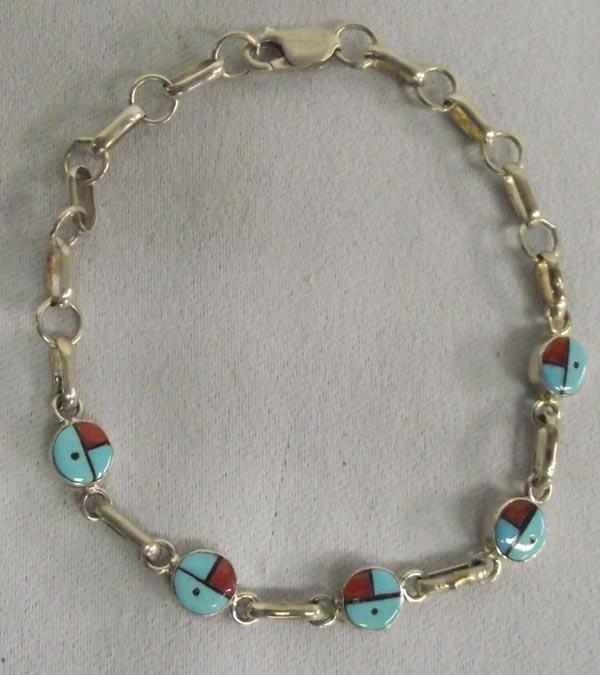 Native American Zuni Inlay Turquoise, Coral, Jet Sun God Link Bracelet by James Cheama. Measures approx. 7'' end to end. Buyers Pay Actual Shipping and Handling Charges(see terms and conditions for more information).