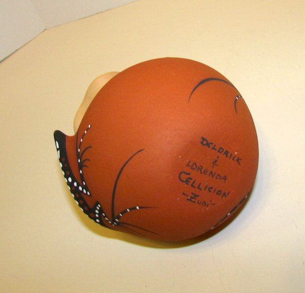 Outstanding Zuni 3D lizard pottery from an award winning and highly collectible Zuni artist D. Cellicion. Fantastic quality piece with detailed 3D lizard design that surrounds the jar. Wonderful condition with no chips, cracks, repairs. Measures 7" tall. Signed "Zuni" and D. Cellicion on the bottom.