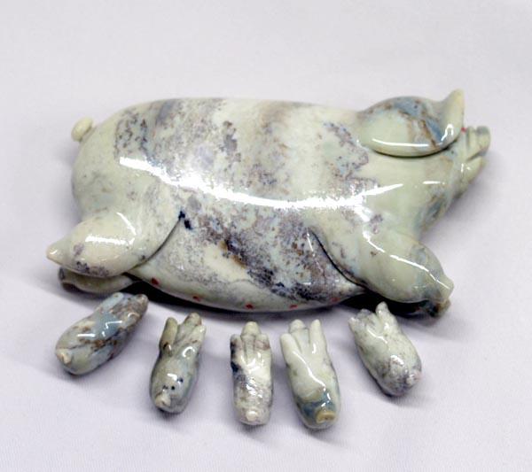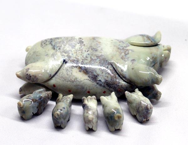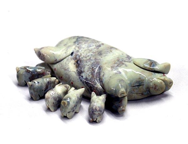 Mama Pig & 5 Piglets Fetishes by Freedie Leekya. May be serpentine stone with coral teets & eyes. Mama measures 4''x2''x1''. Buyers Pay Actual Shipping and Handling Charges(see terms and conditions for more information).