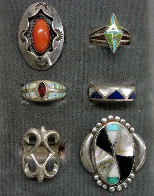 Zuni & Navajo Silver Rings Some w/Hallmarks. The largest setting is abalone, MOP, turquoise, jet and measures 1.5''x1.25'' and is ring size 9.5. Buyers Pay Actual Shipping and Handling Charges(see terms and conditions for more information).