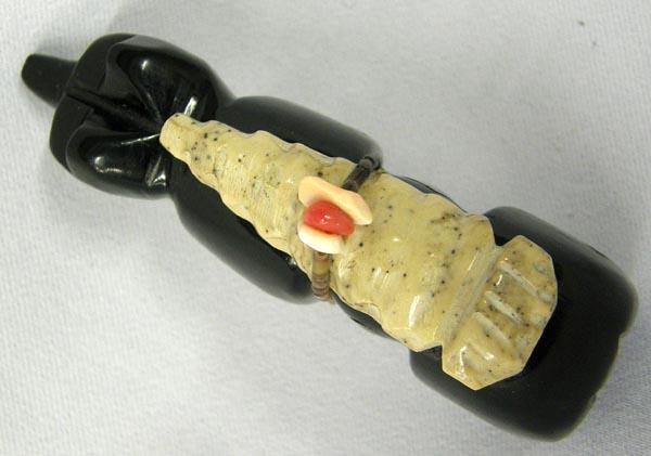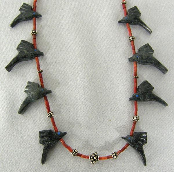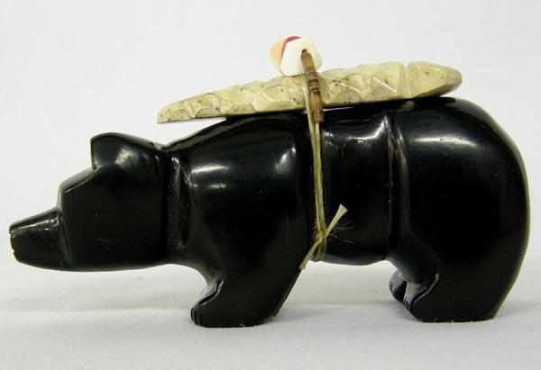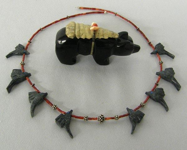 Zuni Jet Bear Fetish and Bird Fetish Necklace. Clasp is missing on the necklace. The bear measures approx. 3.25''Lx.75''Wx1.5''H, the necklace measures approx. 18''L. Buyers Pay Actual Shipping and Handling Charges(see terms and conditions for more information).