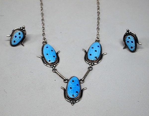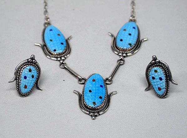 Native American Zuni Necklace & Earrings, bt T E Burnally. Carved Turquoise Corn Necklace & Pierced Earrings. Earrings are 1'' x 3/4''. Necklace is 17.75'' end to end x 1.75'' W Corn. Buyers Pay Actual Shipping and Handling Charges(see terms and conditions for more information)