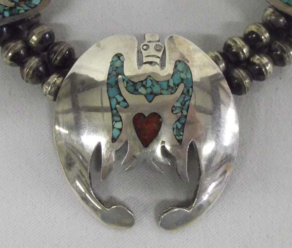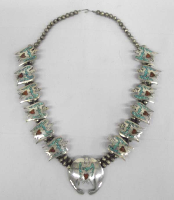 Native American Zuni Peyote Bird Squash Blossom Necklace. Silver with chip inlay turquoise and coral. Vintage necklace measures approx. 25 1/4'' end to end, naja measures approx. 2''L x 2''W, Peyote Birds approx. 1 1/2''L x 1''W. Buyers Pay Actual Shipping and Handling Charges(see terms and conditions for more information).