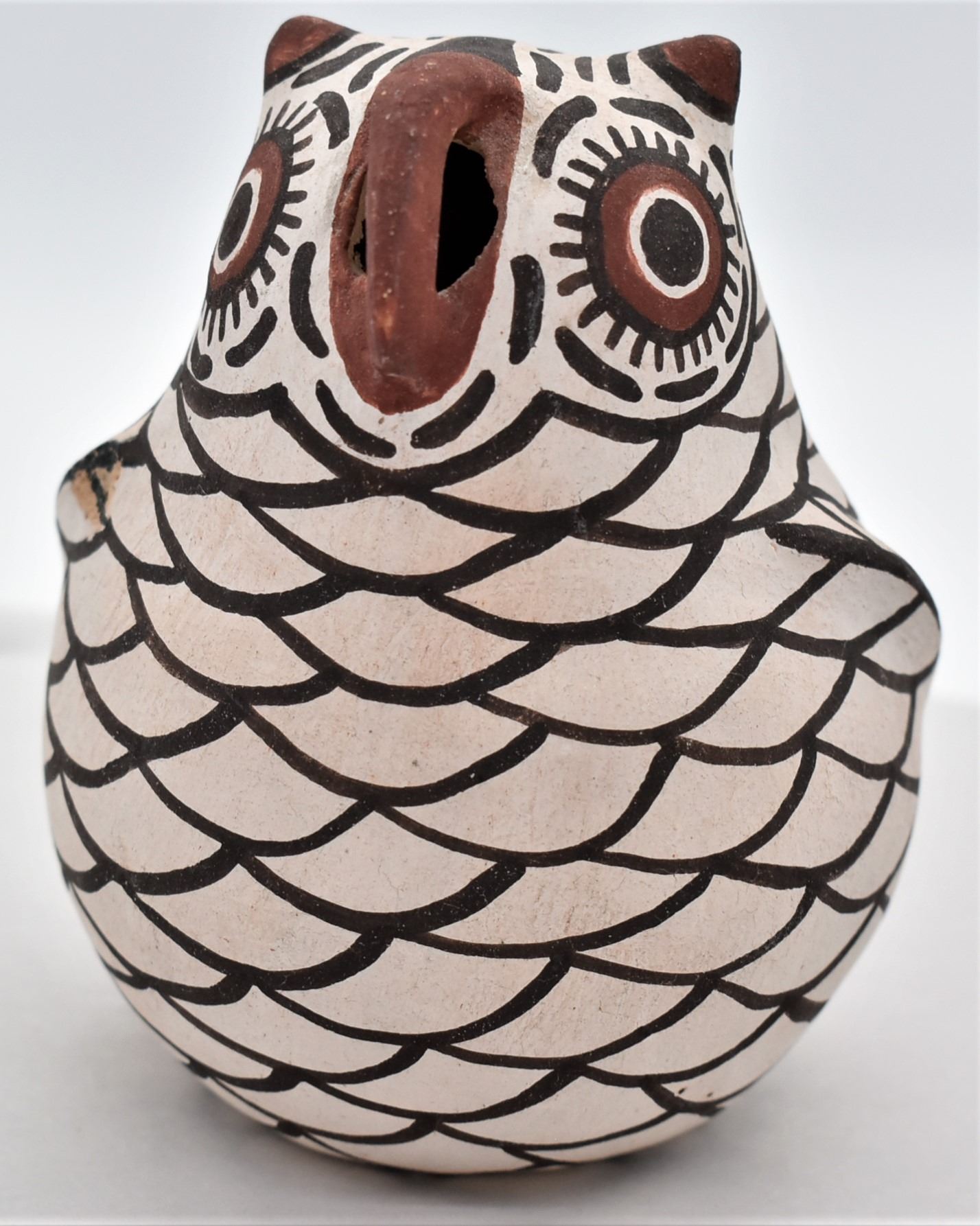 Native American Zuni Pottery Owl by Nellie Bica (1905-1998), measures 3'' x 4'', small chip under right wing, artist's initials NB on the bottom, FYI: ''Nellie Bica is considered one of the most famous Zuni potters of the mid-20th century. She is noted for her pottery owl figurines. In 1917, Nellie learned to make pottery: 'My mother's youngest sister taught me when I was in my teens. Owls were the first potteries I made. That's the way they taught them in those days. I always put babies on my owls. I think I was one of the first to make owls with legs. Now my daughter and three granddaughters make them, too.' After the passing of Tsayutisa and Catalina Zunie, Nellie Bica helped keep pottery making alive at Zuni. Quanita Kalestewa, her daughter, said that Nellie used to fire her pottery early in the morning, ''just when the sun rises.'' Nellie taught her daughter to pray when gathering clay and making pottery.''