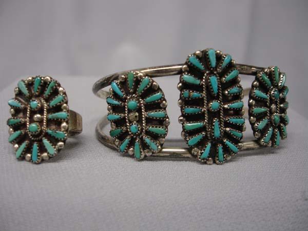 Native American Zuni Petit Point Silver & Turquoise Ring, Necklace & Earrings Set, Screw back Earrings measure .75'' x .5'', Ring is size 4.25, and Bracelet measures 1''W x 6'' inside. Buyers Pay Actual Shipping and Handling Charges(see terms and conditions for more information).