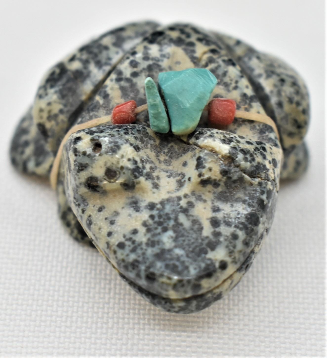 Native American Zuni Serpentine Frog Fetish, measures 1.5''L x 1.25''W x 5/8''H, turquoise nugget and coral bead spirit bundle