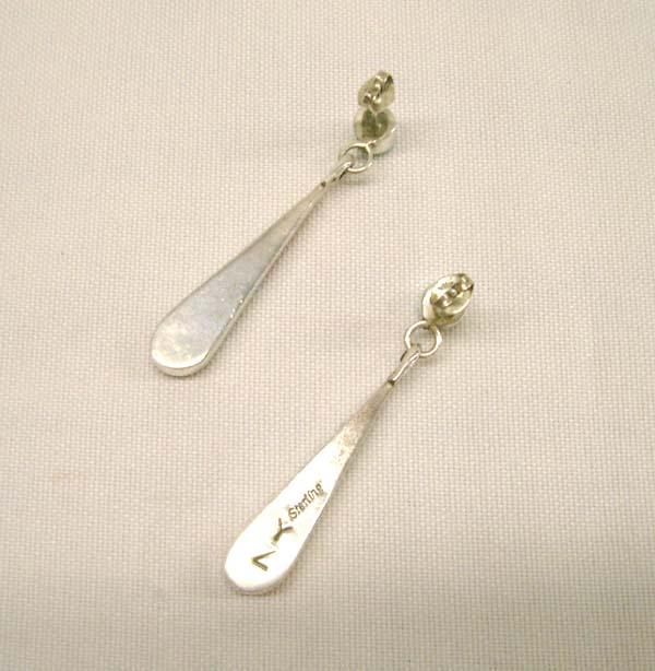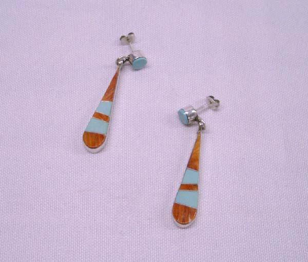 Native American Zuni Sterling Silver with Turquoise and Spiny Oyster Inlay pierced post earrings. Hallmarked YZ and stamped sterling. 1 7/8'' long by 3/8'' wide. Buyers Pay Actual Shipping and Handling Charges(see terms and conditions for more information).