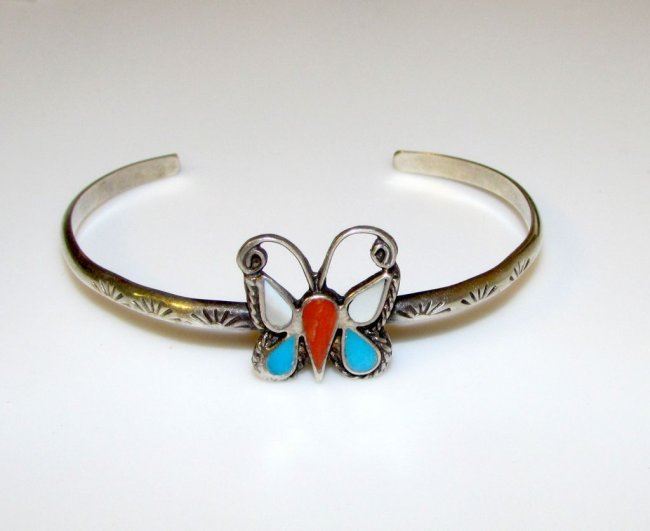 NO BUYER PREMIUM! EASY IN HOUSE SHIPPING! For your consideration is this lovely vintage Native American Zuni sterling silver and turquoise, coral, and mother of pearl butterfly cuff bracelet in wonderful vintage condition. This colorful piece features a detailed traditional zuni stone inlay butterfly design on sterling silver cuff with etched designs. Unmarked as most pieces from the time period. Will fit 7" - 71/2" wrists.
