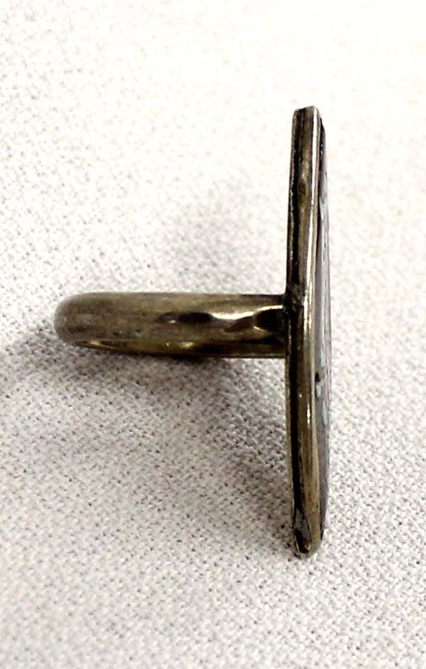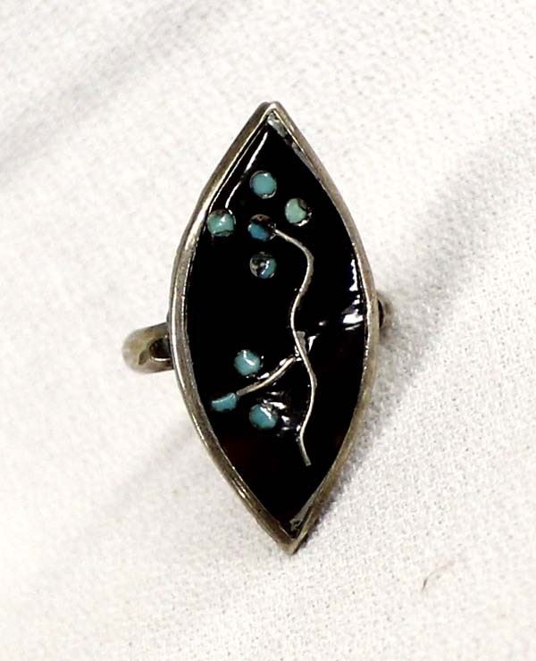 Vintage Native American Zuni Sterling Inlay Flower Ring, size 4.5, measures 1.25''L x .5''W
