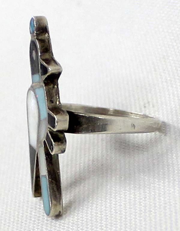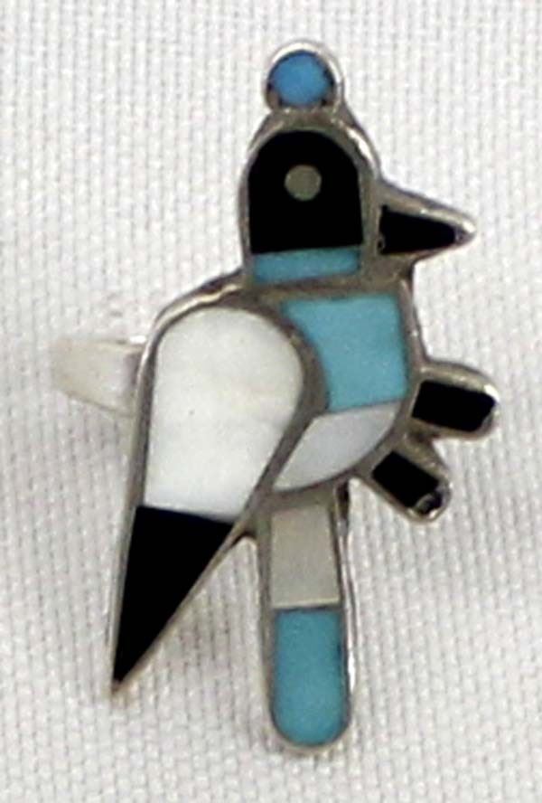 Vintage Native American Zuni Sterling Inlay Quail Ring, size 6 and measures 1.25'' x 5/8''W, inlay of turquoise, jet, abalone, and mother of pearl
