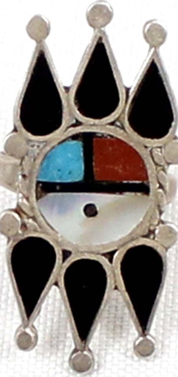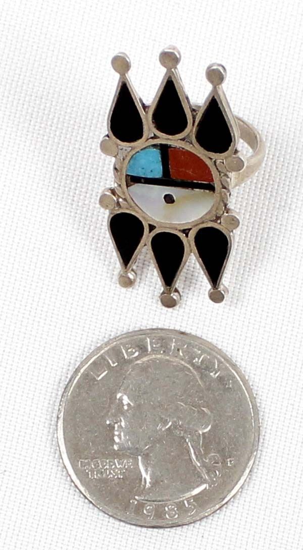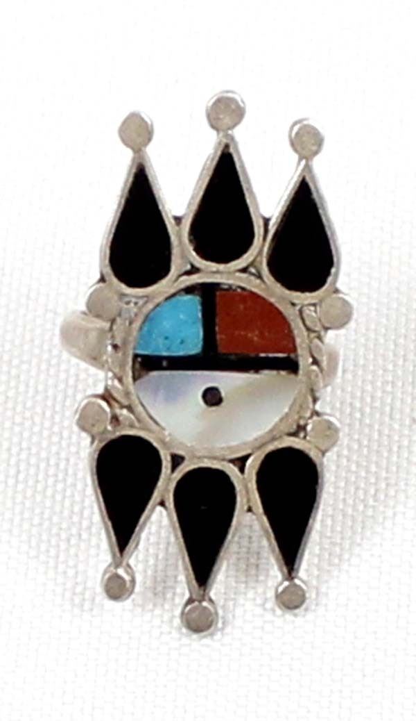 Native American Zuni Sterling Inlay Sun Face Ring, Size 6 and measures 5/8''W x 1 3/8''L, inlay includes onyx, mother of pearl, turquoise, and coral