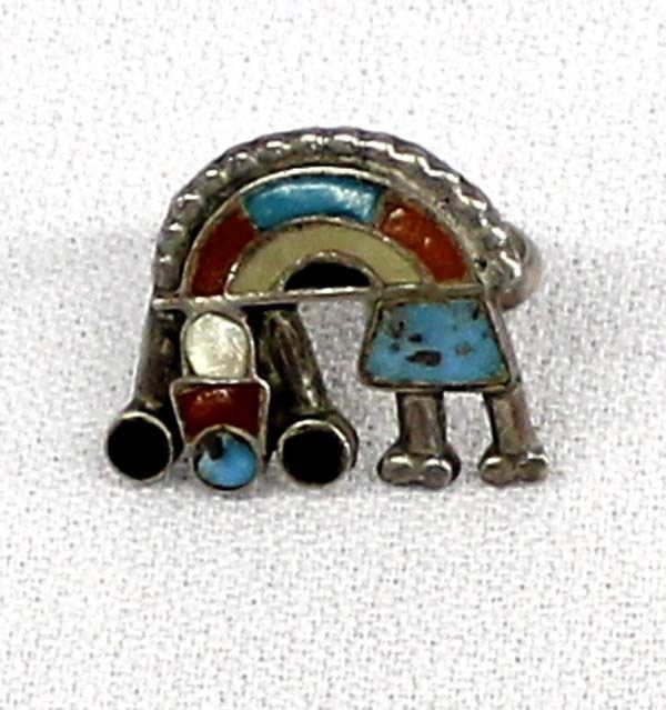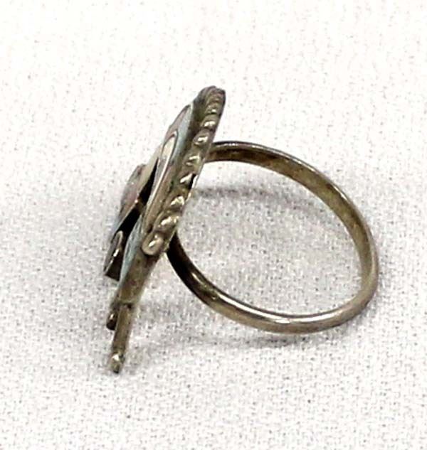 Vintage Native American Zuni Sterling Inlay Rainbow Man Ring, Size 7, measures .75'' x .75'', inlay includes turquoise, coral, gold lip shell, and jet