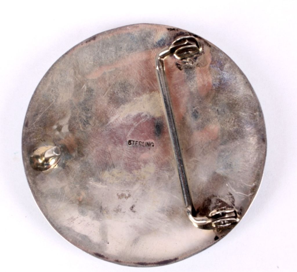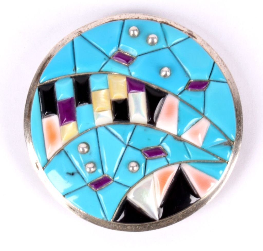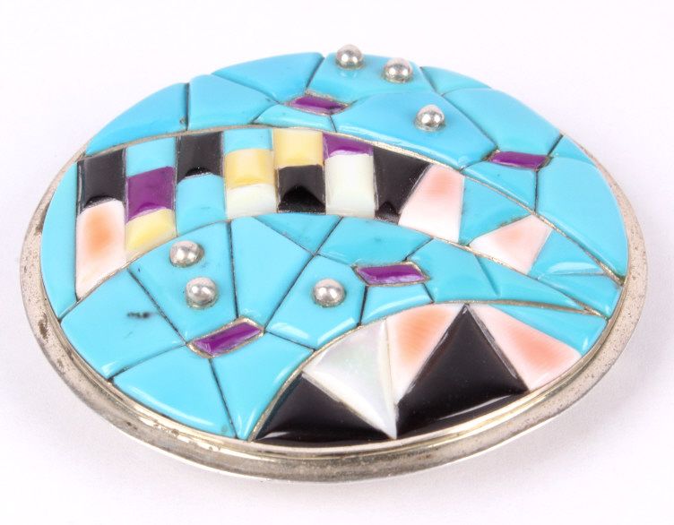 This lot features a Native American Zuni inlayed belt buckle. It is sterling silver and marked on the back. It measures 2.75" in diameter.