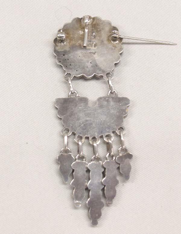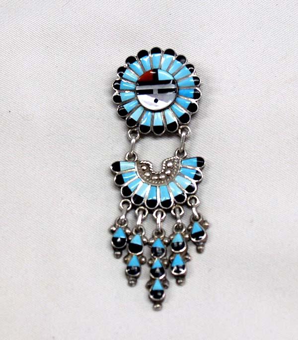 Native American Zuni Sterling Inlay Sunface Pin/Pendant by FJ, turquoise, jet, MOP, & coral inlay. Measures approx. 3.25''L x 1.25''W. Buyers Pay Actual Shipping and Handling Charges(see terms and conditions for more information).