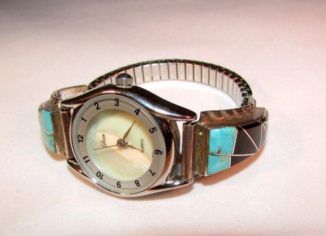 For your consideration is this wonderful vintage Native American Zuni sterling silver turquoise and onyx inlay lady's watch band and quartz watch in wonderful vintage condition. The band is marked with an artist's hallmark "W" and is stamped "sterling". Wonderful, classic design with a southwestern touch. The watch measures about 1" wide and the bracelet is adjustable.