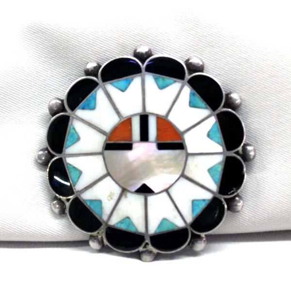 Native American Zuni SunFace Pin, channelwork of turquoise coral jet and shell, measures approx. 2.25''Diameter. Buyers Pay Actual Shipping and Handling Charges(see terms and conditions for more information)