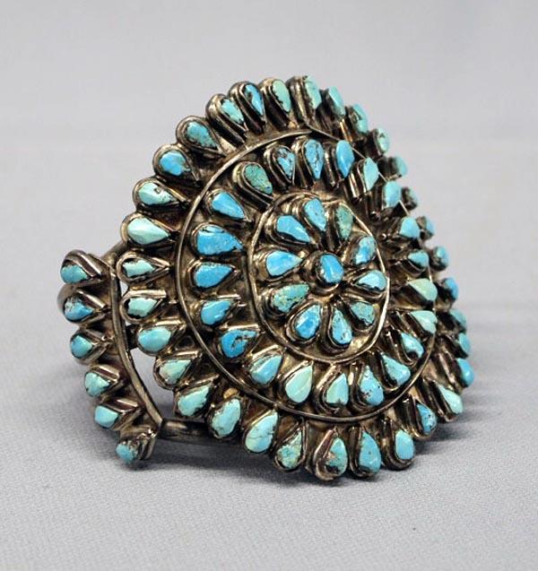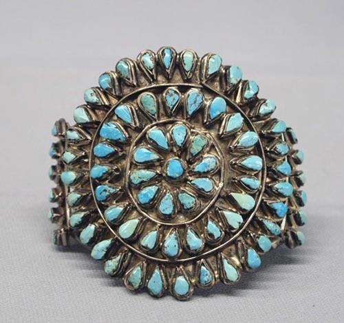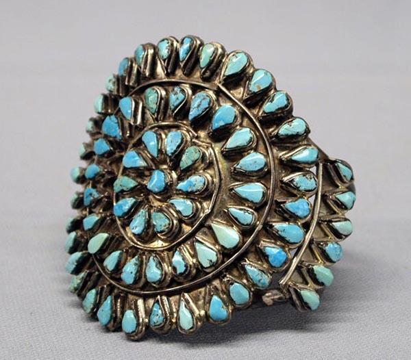Native American Zuni Turquoise Cluster Bracelet. Matched turquoise stones. Measures 7'' inside including opening and 1-3/4'' at widest. Buyers Pay Actual Shipping and Handling Charges(see terms and conditions for more information).