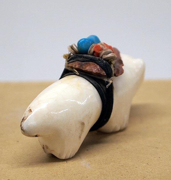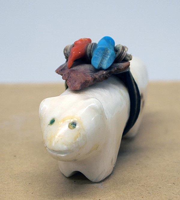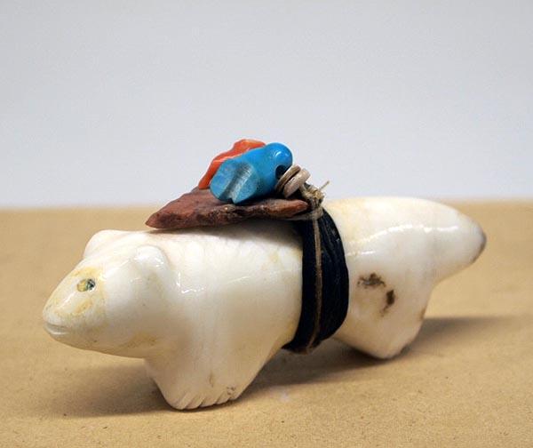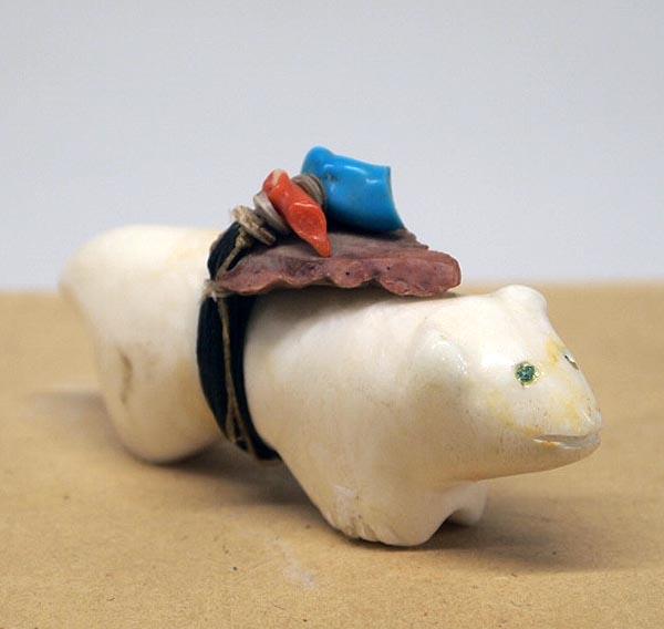 Native American Zuni Vintage Standing Bear Fetish, has turquoise arrowhead powerpack on back, measures 3.5''H x 1''W. Buyers Pay Actual Shipping and Handling Charges(see terms and conditions for more information).