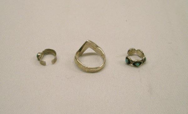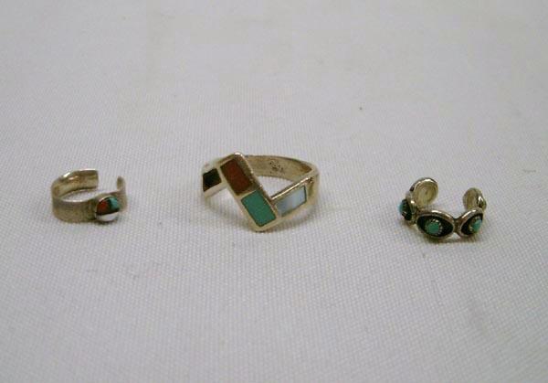 Native American Zuni Sterling Silver ring and 2 ear cuffs. Ring size 7.5, missing 1 stone inlay, hallmarked dp One ear cuff is turquoise, other is MOP, coral and turquoise. Buyers Pay Actual Shipping and Handling Charges(see terms and conditions for more information)