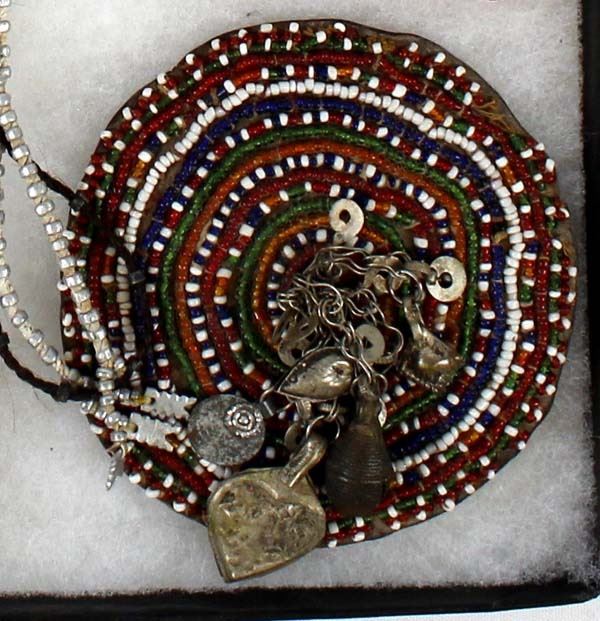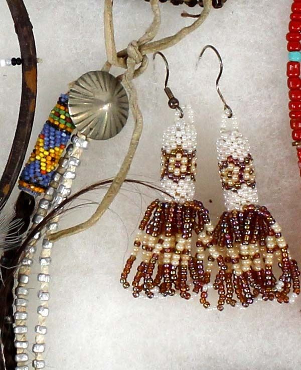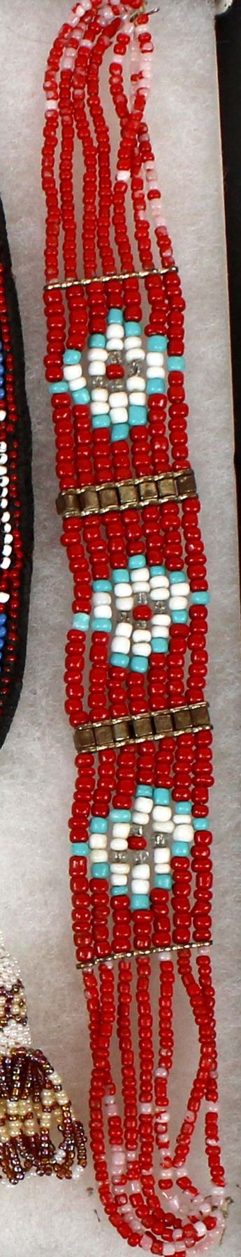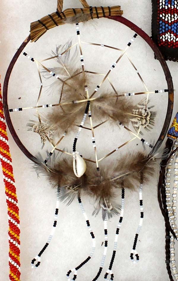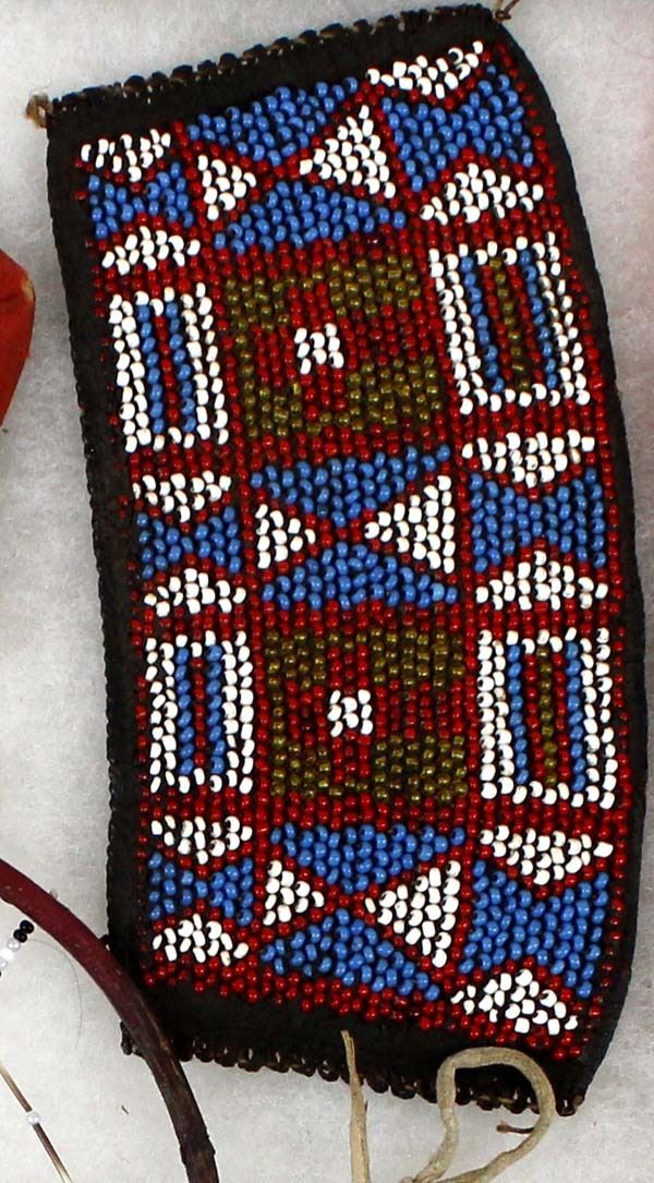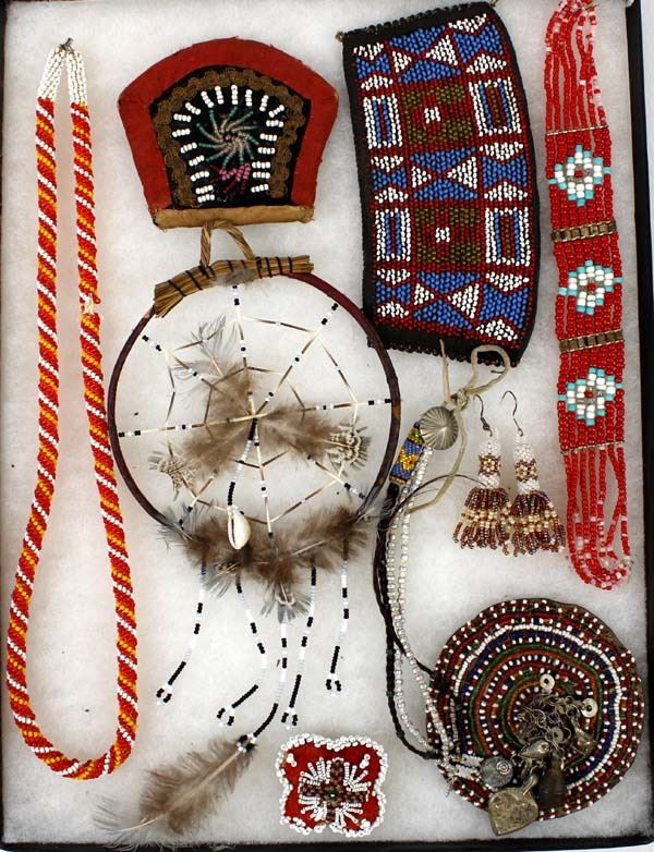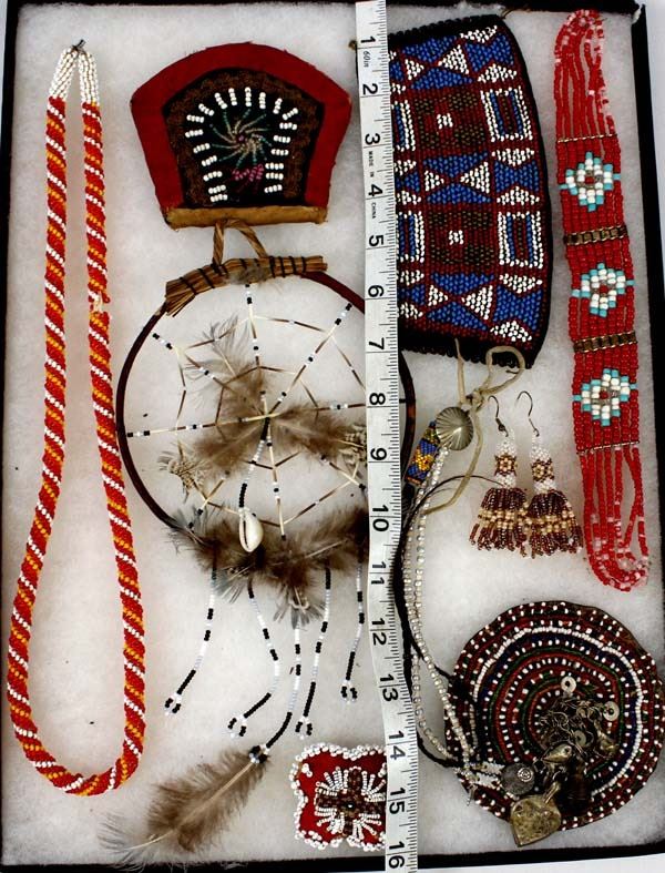 Native American and African Beaded Collectibles, includes 1. Native American Beaded Necklace, measures 28''L end to end 2. Antique Native American Haudenosaunee Pouch, wear on the outer material edges, measures 3.5'' x 4'', ca. 1860s 3. Native American Porcupine Quill and Bead Dream Catcher, measures 13''L (including feathers) x 5.5''D 4. Native American Iroquois Beaded Pin Cushion, measures 2'' x 2'' 5. African Beaded Medallion with Metal Embellishments, measures 4.25'' x 5'' 6. Native American Beaded Hair Embellishment, measures 15''L x 1''W 7. Native American Beaded Earrings, measure 3''L which includes the wire 8. African Beaded Wrist Band, measures 4'' x 7'' 9. Native American Beaded Arm Band, measures 11.5'' x 1''W