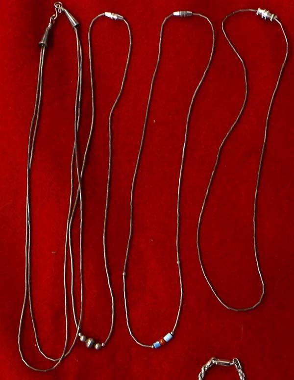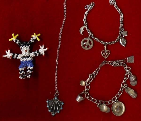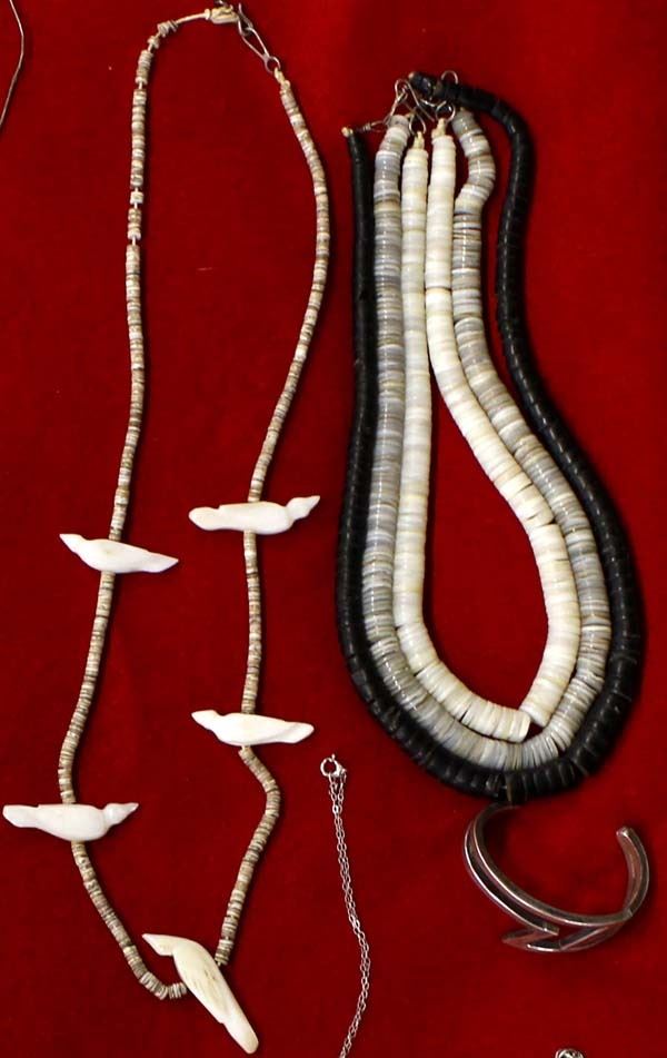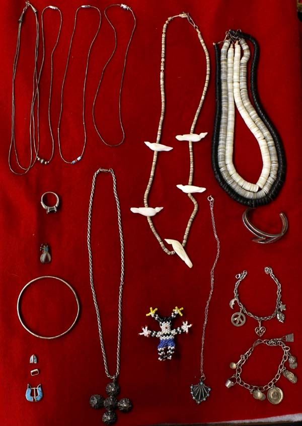 Native American and Mexican Collectibles, includes: 1. Antique/Vintage Sterling Silver Cross Pendant Necklace, Italian Sterling Chain measures 19''L end to end and cross pendant measures 2''L, Medieval Style Cross, 21.34g in total wt. 2. Three Native American Heishi Bead Chokers, longest measures 16''L with largest bead measuring .5'' 3. Sterling Silver Amethyst and Opal Ring, Size 7, stamped .925, missing one of the rhinestones on one side 4. Navajo Sterling Inlay Turquoise, Coral, Jet Child's Ranger Belt Buckle, measures .75'' x .75'' 5. Vintage Mexican Sterling Silver Charm Bracelet, measures 8''L end to end 6. Sterling Silver Charm Bracelet, measures 7.25''L end to end 7. Double Lightning Bolt Bracelet, inside measures 5.25'' which includes the opening x 1''W 8. Four Navajo Liquid Silver Necklaces, largest measures 16''L end to end 9. Santo Domingo Mother of Pearl Bird Fetish and Shell Heishi Necklace, measures 24''L end to end 10. Zuni Sterling Turquoise Pendant Necklace, sterling chain measures 17''L end to end and pendant measures 1.25'' x 1'' 11. Sterling Bangle Bracelet, hallmarked KMI 12. Zuni Beaded Clown, measures 2.5'' x 2.5'' 13. Vintage Navajo Bug Pin, measures 7/8'' x .75''