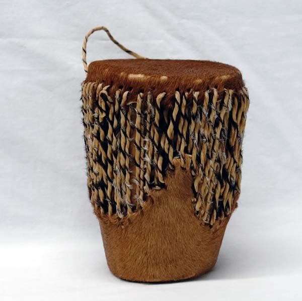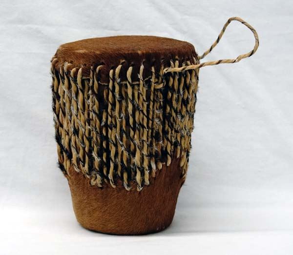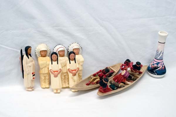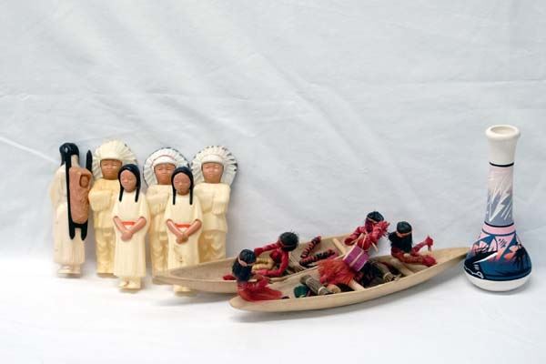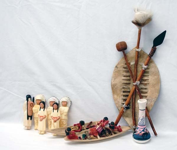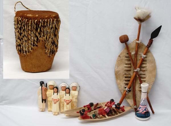 Native American and Tribal Collectibles, includes 1. Cowhide Covered Drum, measures 5'' x 7'', leather handle and leather and hide ties, 2. African Miniature Cow's Hide War Shield. Decorated with deer hide this piece measures approx. 19'' x 8'' 3. Six Plastic Native American Dolls 4. South American Wood and Fiber Canoes and Dolls
