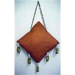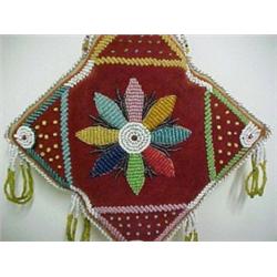 Native American beaded pillow 7 1/2" square decorative pillow, hand beaded on rust colored velvet, central flower design with four corners accented in different pastel colors, hand stitched and beaded edge with 14" beaded chain for hanging and beaded tassles, plain cotton back, C. 1890-1910 Estimate 120/180