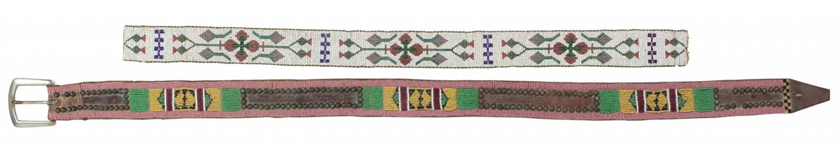 Native American beadwork (2), rivet & beadwork belt, hide, cloth & sinew, small beadwork runner, clo