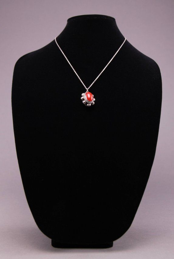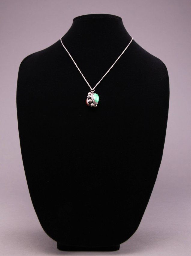 Native American coral and turquoise pendant sterling silver necklace. (Size: See last photo for measurement.) Photos are part of the description representing the condition report. Pangaea Auctions urges Bidder's to view all attached photos.