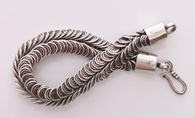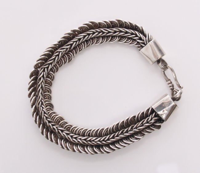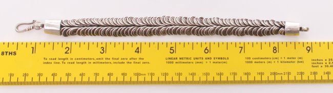Native American custom made sterling silver loop bracelet. Provenance: collection of Joe Dan Osceola. SIZE: see attached ruler photo. Photos are part of the description representing the condition report and can be used for authentication prior to the sale date. Pangaea Auctions urges Bidder's to view all attached photos in detail.