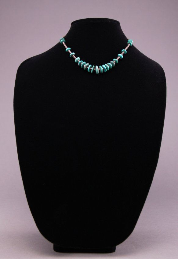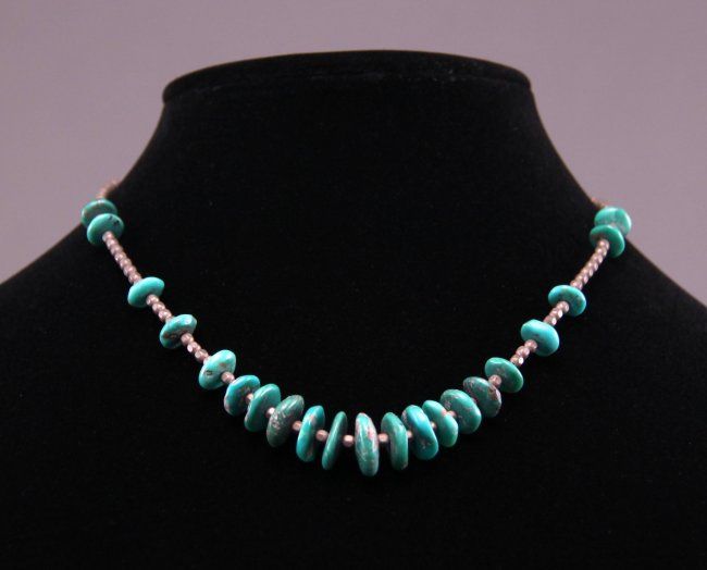 Native American green turquoise necklace. (Size: See last photo for measurement.) Photos are part of the description representing the condition report. Pangaea Auctions urges Bidder's to view all attached photos.