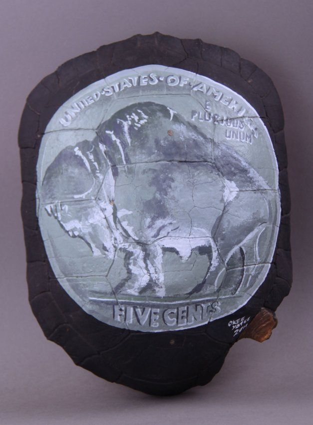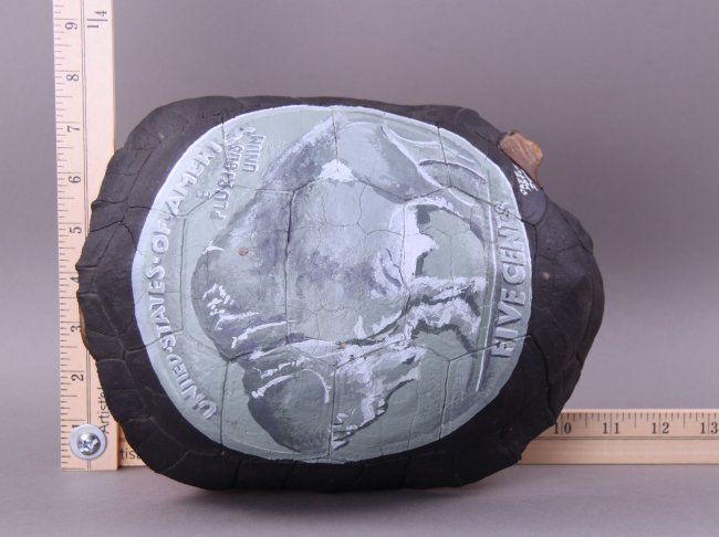 Native American hand painted turtle shell of a Buffalo Nickel signed, "Okee Yatee 2011"(Size: See last photo for measurement.) Photos are part of the description representing the condition report. Pangaea Auctions urges Bidder's to view all attached photos.