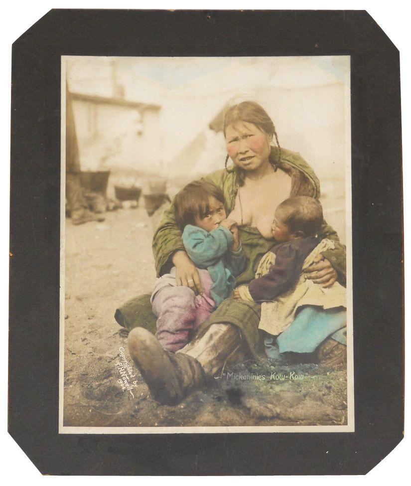 Native American hand-tinted photograph, titled "Michaninies Kow-Kow", copyrighted by F.N. Nowell-a noted Alaskan photographer, c.1904, shows mother nursing her two children, Rare, VG cond, 10"H x 8"W.