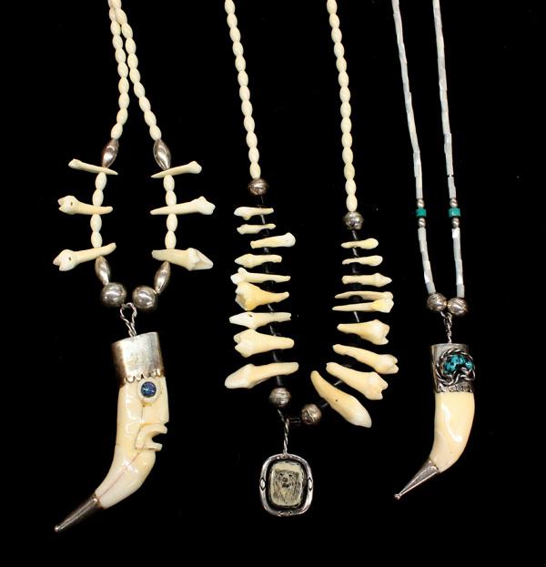 (lot of 3) Native American necklaces by Pat Archambault, including a silver, animal tooth, and carved bone necklace having a figural carved claw pendant with opal eyes, a shell and turquoise necklace having a sterling mounted claw pendant, and a silver, animal tooth and carved bone necklace with engraved bone pendant depicting a bear