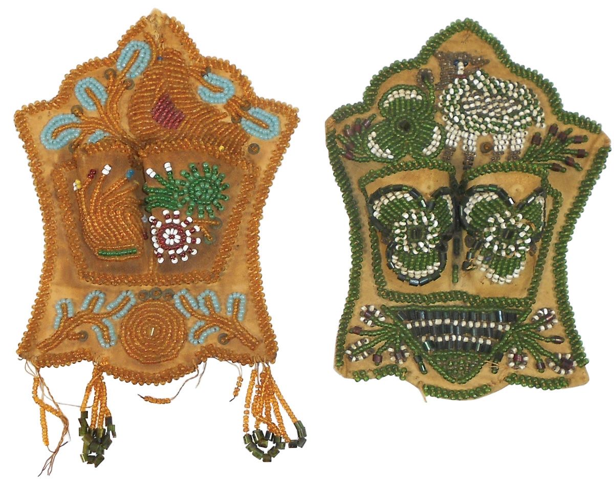 Native American match holders (2), ornate colorful artwork, probably made for the tourist trade but retain their beauty, one w/bird & one w/sheep, both w/2 pockets, backs are fabric-lined & have lost their hangers, some missing beads, Good/VG cond, 8.75"H x 6.25"W.