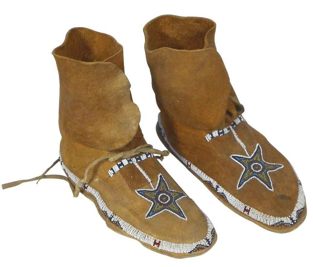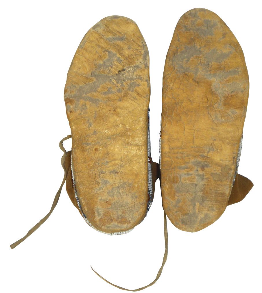 Native American moccasins, softly tanned hide, thread & sinew, beaded w/red, white, teal, yellow, dark blue, dark green colors, pre 1920, VG+ cond w/signs of light use, 7"H x 4"W x 10.5"L.