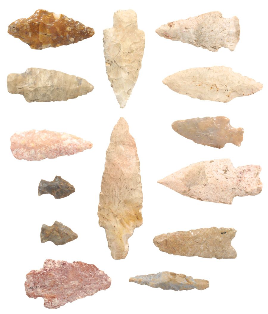 Native American points or blades, knife & drill (14), various colored stone specimens from Iowa, Cen
