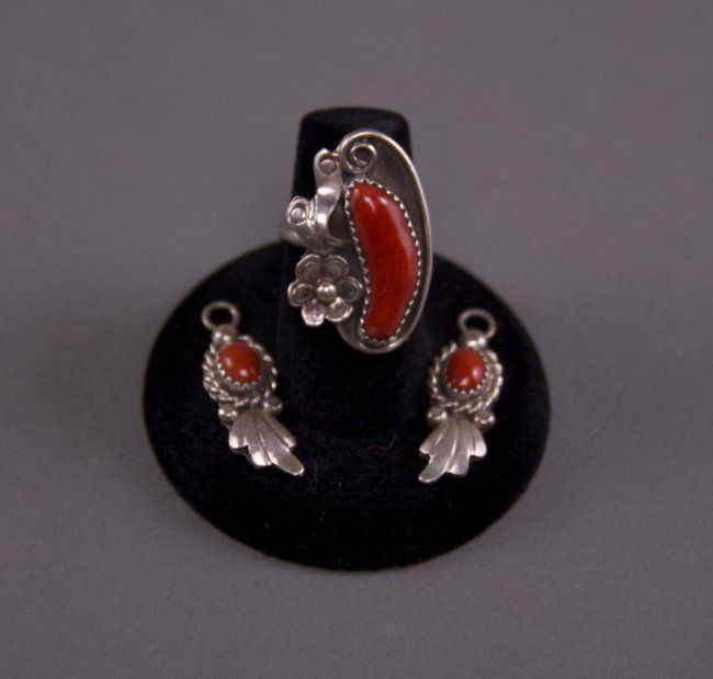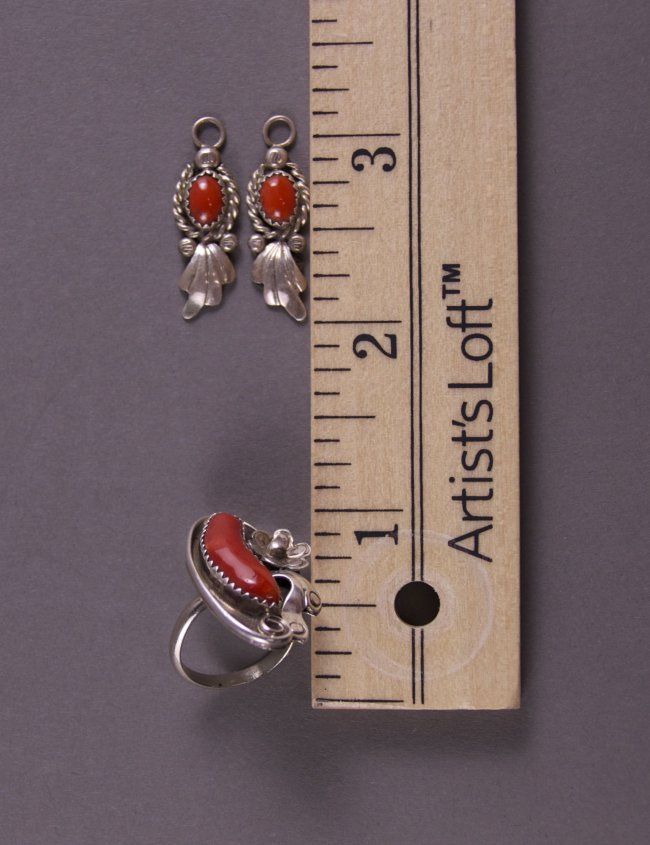 Native American red coral set of ring and earrings.(Size: See last photo for measurement.) Photos are part of the description representing the condition report. Pangaea Auctions urges Bidder's to view all attached photos.