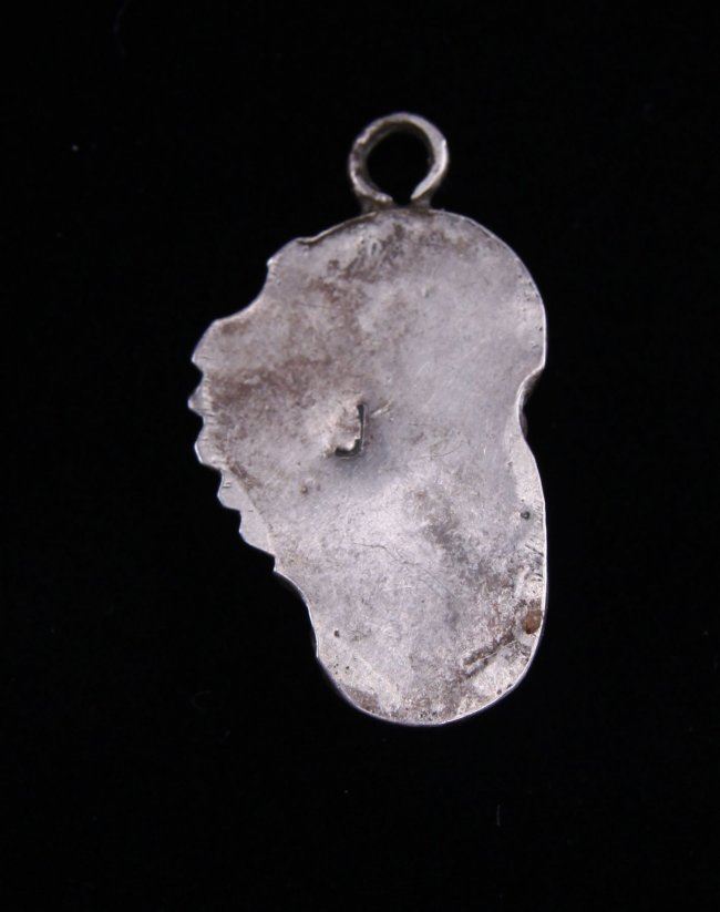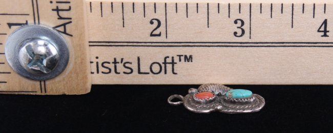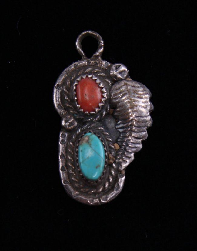 Native American sterling silver turquoise and red coral pendant, stamped by artist. (Size: See second photo for measurement.) Photos are part of the description representing the condition report. Pangaea Auctions urges Bidder's to view all attached photos.