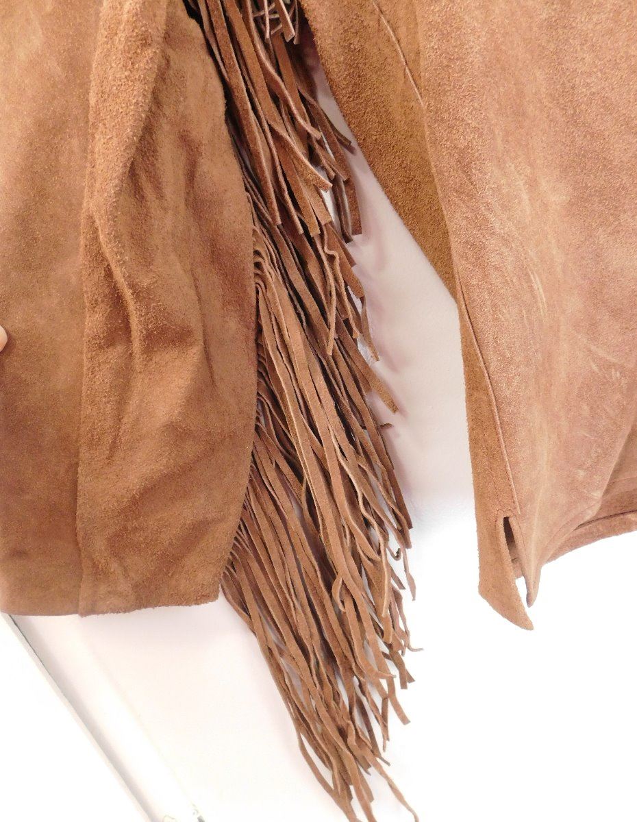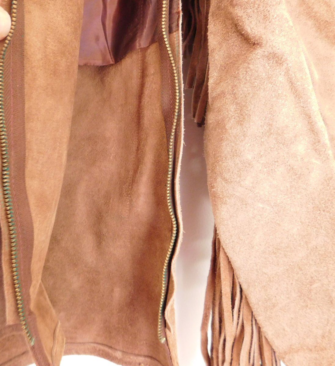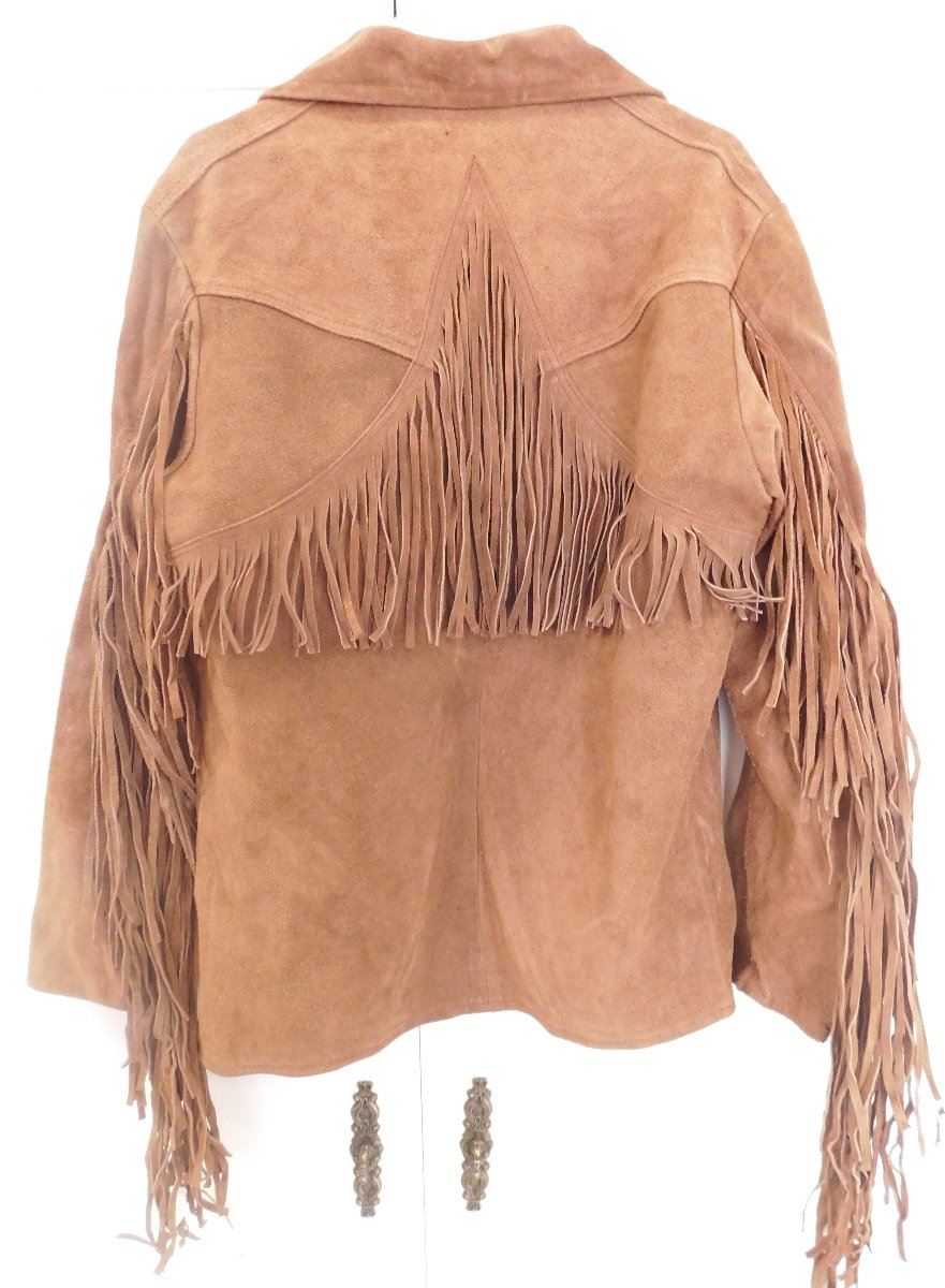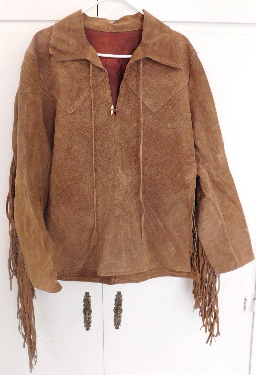 Native American-style War Shirt, circa 1980s. Made of leather and metal zipper, the item is probably a Men's medium, measuring 18" across the chest and 29" tall. From Western USA. Long fringe on this jacket. Condition: Good, see images. Shipping: $22.50 w/insurance and signature.