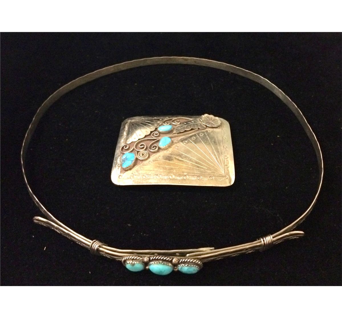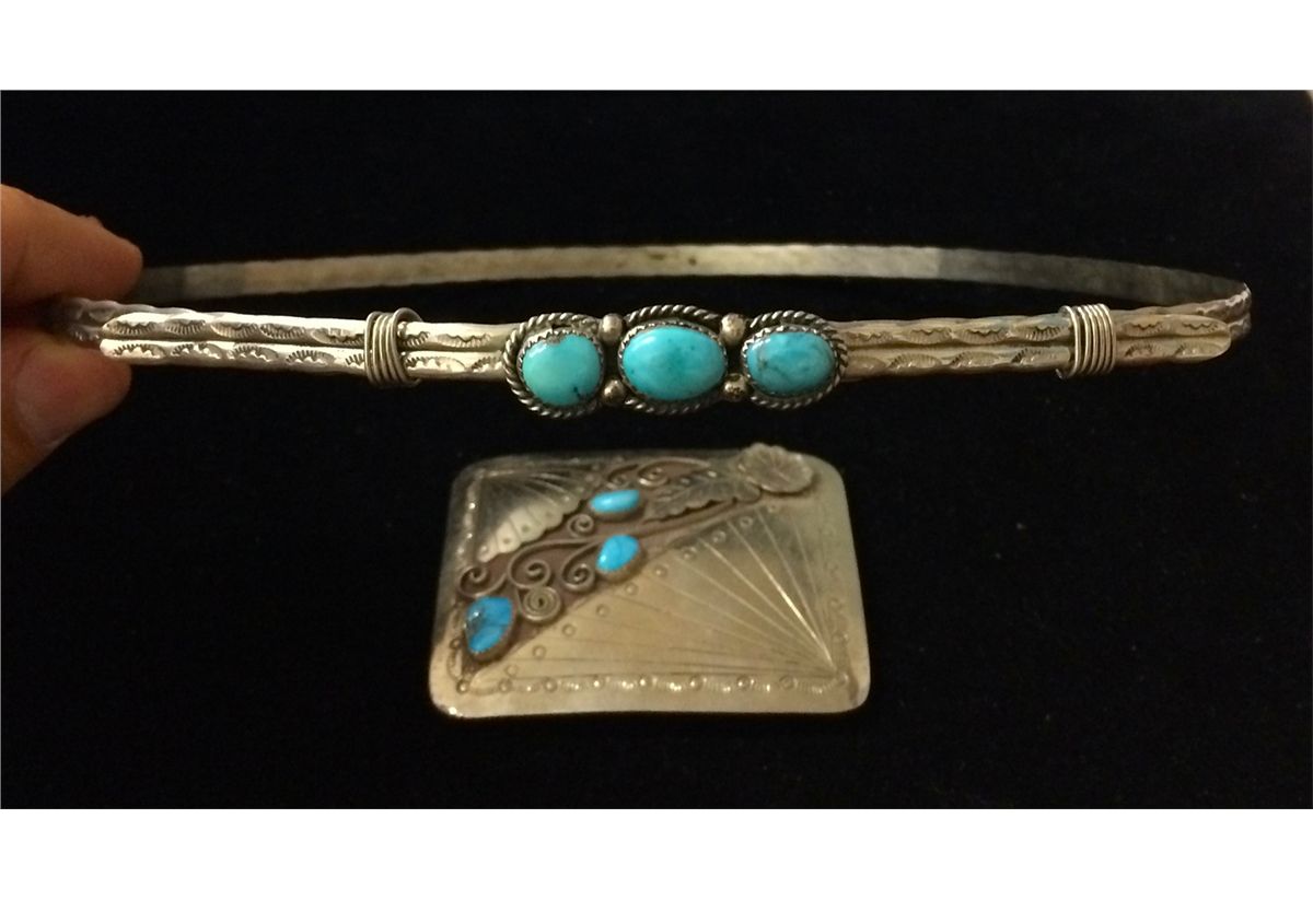 You get two pieces for one price in this lot. One is a hat band with three turquoise cabochons and it is adjustable. There is also a nice belt buckle with three turquoise cabochons. The belt buckle fits a standard 1.5” wide or smaller belt.