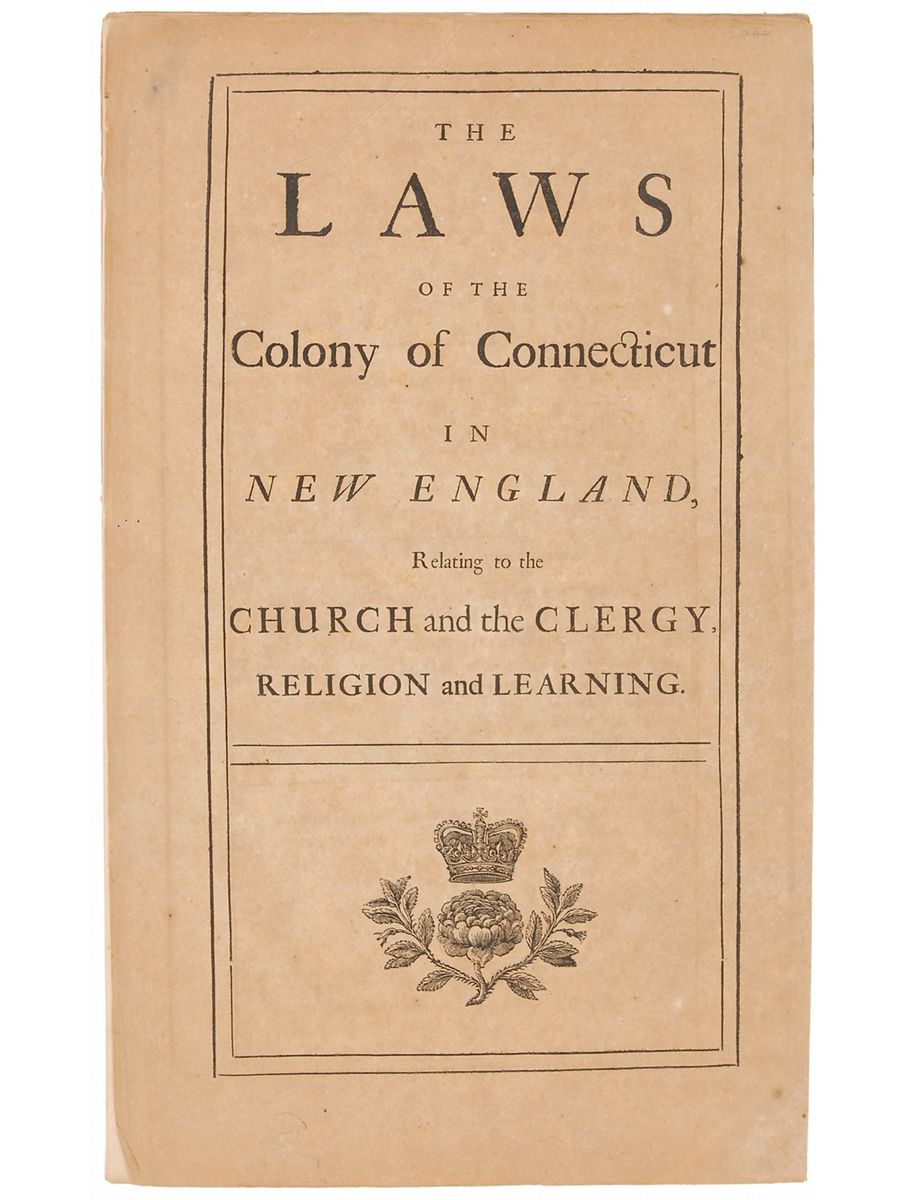 Partial printed document entitled, “The Laws of the Colony of Connecticut in New England, Relating to the Church and the Clergy, Religion and Learning,” 18 pages, 8.75 x 14.25, with 285-286 not present and evidently not part of the printing. This chapter is taken from a larger volume entitled The Laws of the British Plantations in America, Relating to the Church and the Clergy, Religion and Learning, published in 1721. Final page, part of a larger act, reads, in part: “That if any Indian or Indians shall labour or play on the Sabbath Day, within the Limits of any English Town, every such Indian, being duly convicted, shall pay a Fine of Five Shillings, whereof one Half shall be to the Complainer, the rest to the County Treasury, or else set in the Stocks one Hour…And be it further Enacted…That no Indian or Indians shall at any time Powaw or perform outward Worship to false Gods, or to the Devil, within this Colony, on pain of forfeiting the Sum of Five Pounds to the Publick Treasury of this Colony for every time any Indian or Indians shall be convicted of performing or doing the same. And if any Person or Persons of the Age of Twenty Years or upwards, shall at any Time be present at any Indian Play or Powawing at any of their General Meetings, every such Person shall forfeit the Sum of Forty Shillings; and if any Person shall join in playing with any Indian or Indians, or shall lay any Wager with or for any Indian about or concerning any such Play or Game, he shall forfeit and pay a Fine of Ten Pounds.” In very good condition, with final two pages detached, uniform toning, heavier to first and last pages, and some light foxing and creasing.